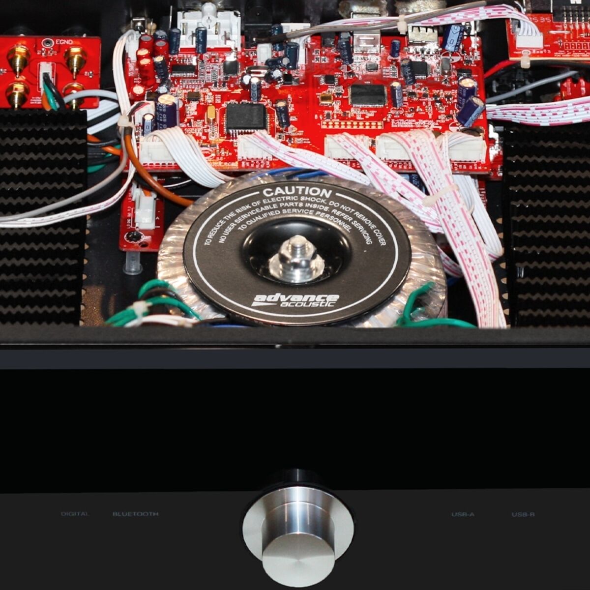 Der Advance Acoustic X-i75 überzeugt mit äußeren und inneren Werten. Die Front begeistert mit edlem Acryl, die Bedienelemente sind aus massivem Aluminium gefertigt. Ein Blick «unter die Haube» offenbart einen mächtigen Ringkerntrafo um den herum sich hochwertige Komponenten gruppieren.