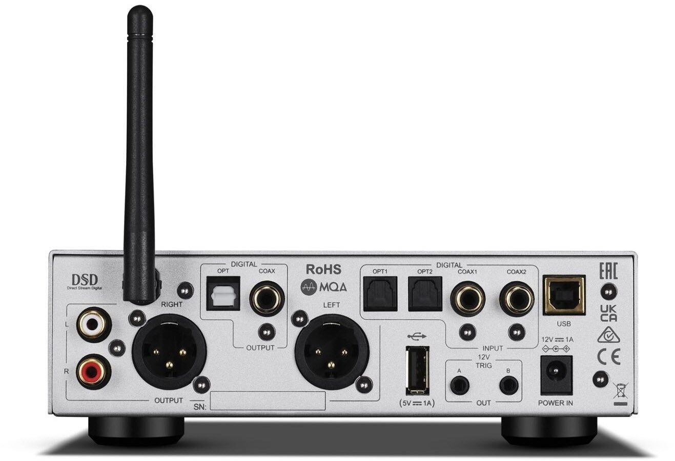 Ob CD-Transport, Streamer oder Computer – der D7 bietet die passenden Eingänge: 2 × koaxial, 2 × optisch, 1 × USB-B (für PC/Mac), 1 × USB-A (für Speichermedien) sowie Bluetooth 5.1 mit aptX und aptX HD. Ausgänge stehen wahlweise in Cinch (RCA), XLR (symmetrisch), koaxial und optisch zur Verfügung. Zusätzlich sind zwei 12V-Trigger vorhanden – ideal für die Integration in komplexe Setups.