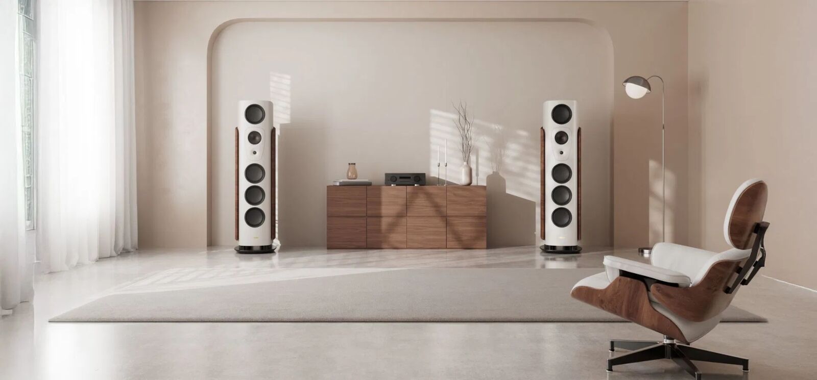 Das elegante, geschwungene Design der Reference Alpha vereint Ästhetik und Funktion. Die gebogenen Seitenwände, gefertigt aus mehrschichtigem Holz, bieten außergewöhnliche Stabilität und minimieren Resonanzen. Veredelt mit dem hochwertigem Materialmix, fügen sie sich harmonisch in das Gesamtkonzept ein. Die akustisch optimierten Rundungen verhindern Kantenreflexionen und verleihen dem Lautsprecher seine imposante, gleichzeitig zeitlose Erscheinung.