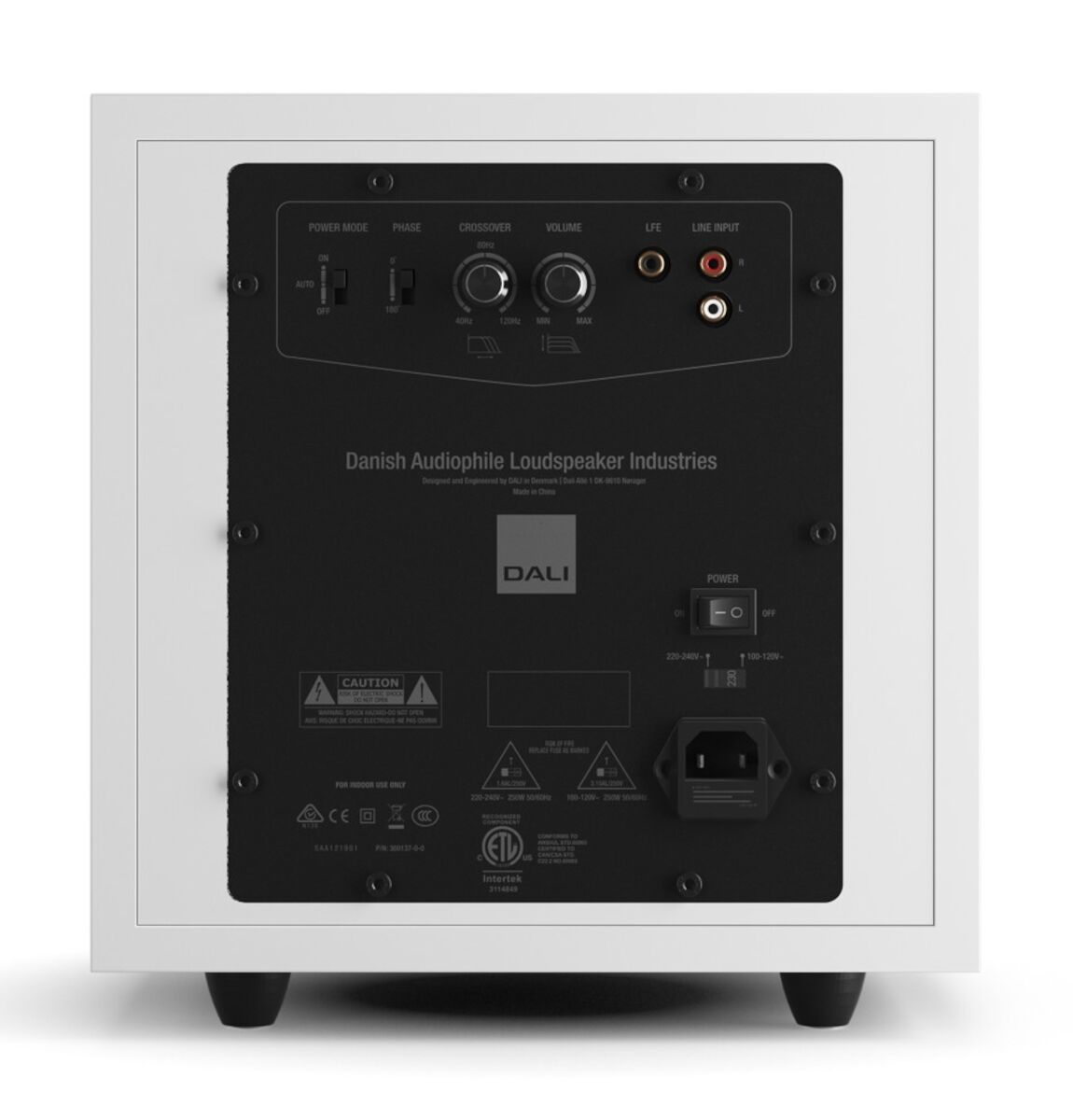 Der DALI SUB E-9 F ist in drei verschiedenen Gehäuseausführungen lieferbar: Zur Wahl stehen Folienoberflächen in schwarzer Esche, heller Walnuss und in weiß. Die Frontwände sind hochglänzend schwarz bzw. weiß lackiert und enthalten versteckte Magneten, mit deren Hilfe sich die als optionales Zubehör verfügbaren Frontabdeckungen fixieren lassen. Abgerundete Gummifüße verleihen dem Subwoofer einen sicheren Stand und koppeln ihn akustisch vom Untergrund ab.