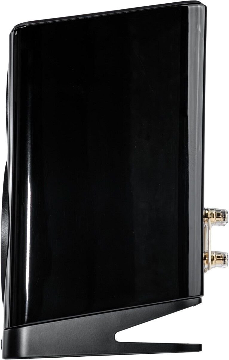 Ihr Design ist augenfällig: hochwertig lackierte oder furnierte Gehäuse, trapezförmig und nach hinten geneigt, treffen auf Aluminium. Große Radien an den Gehäusekanten und die konvex geformte Schallwand fangen das Umgebungslicht und erschaffen optische Tiefe.