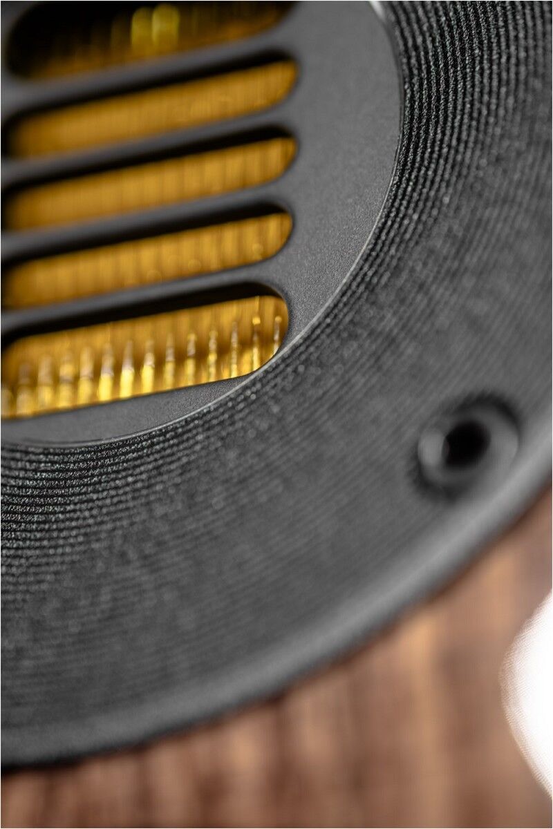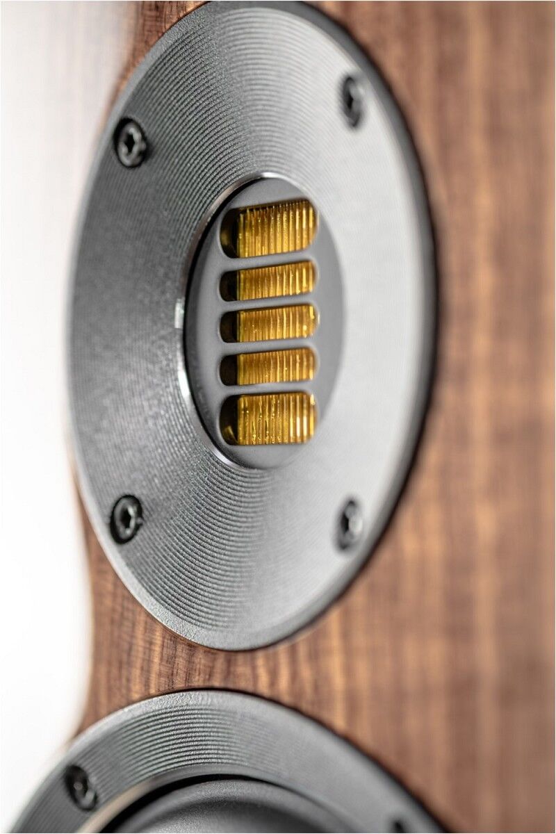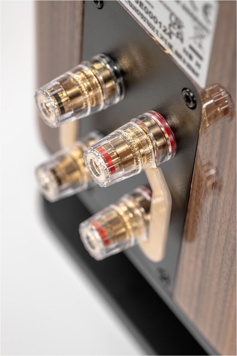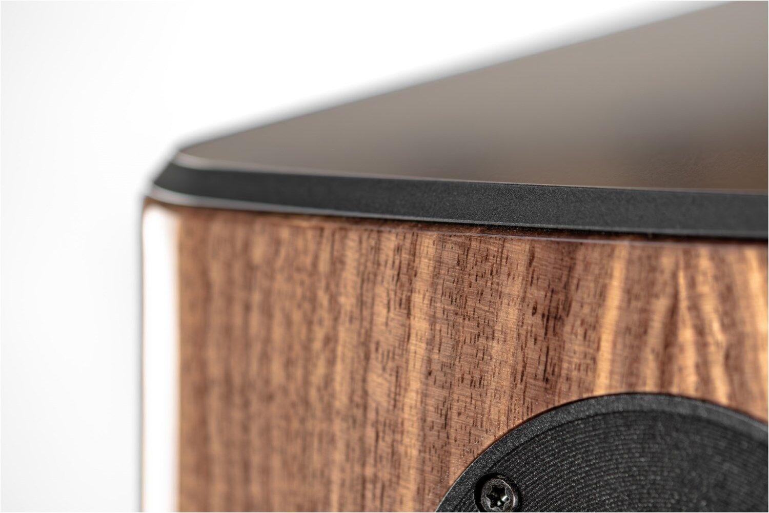 Ihr Design ist augenfällig: hochwertig lackierte oder furnierte Gehäuse, trapezförmig und nach hinten geneigt, treffen auf Aluminium. Große Radien an den Gehäusekanten und die konvex geformte Schallwand fangen das Umgebungslicht und erschaffen optische Tiefe.