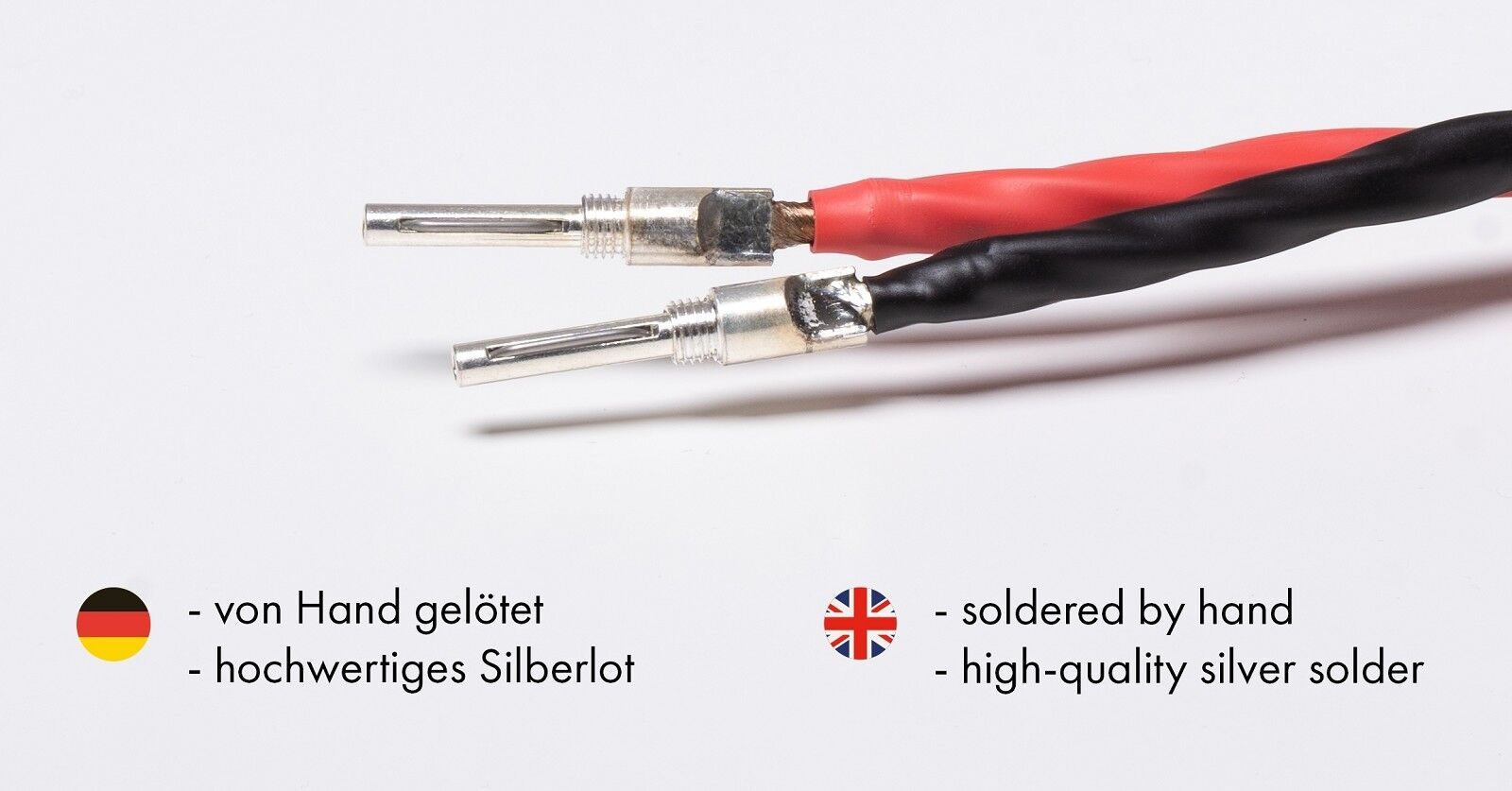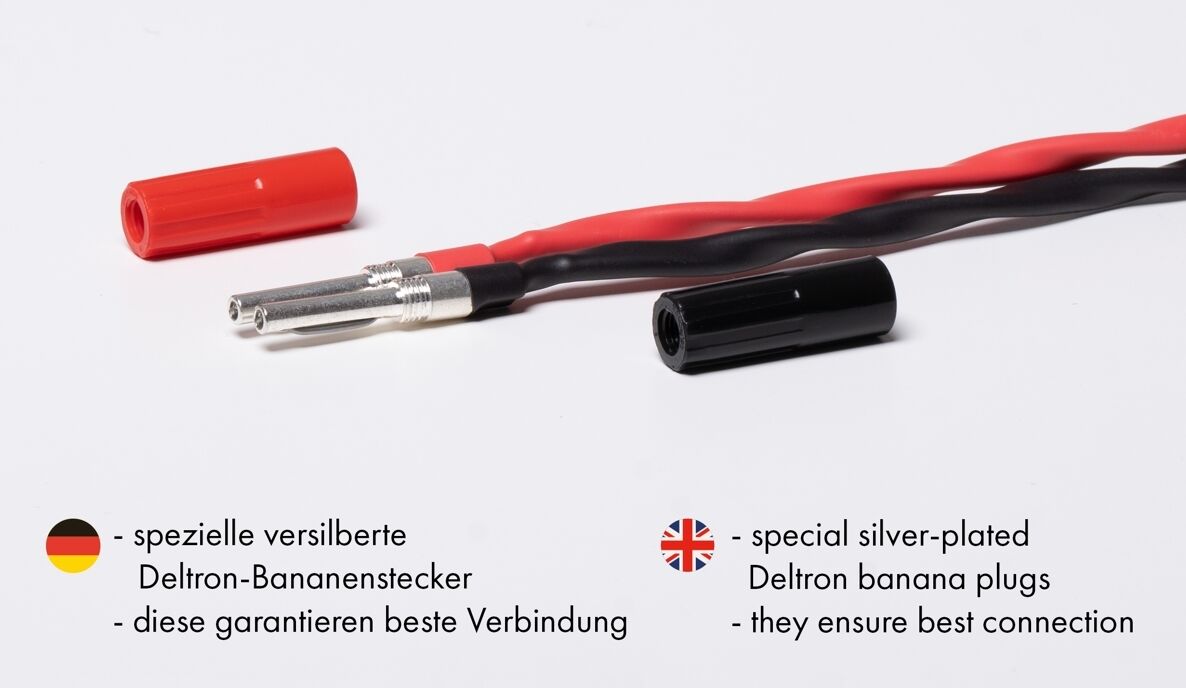 Das FLUX-Matrixx LS-8 besteht aus einem Kabel „made in Germany“ und silber beschichteten Bananensteckern von Deltron „made in England“ konfektioniert bei FLUX-Hifi in Deutschland. Die Stecker sind alle handverlötet durch unsere Löterinnen (über 30 Jahren Löterfahrung) mit Silberlot 4% Silberanteil von ViaBlue Deutschland.