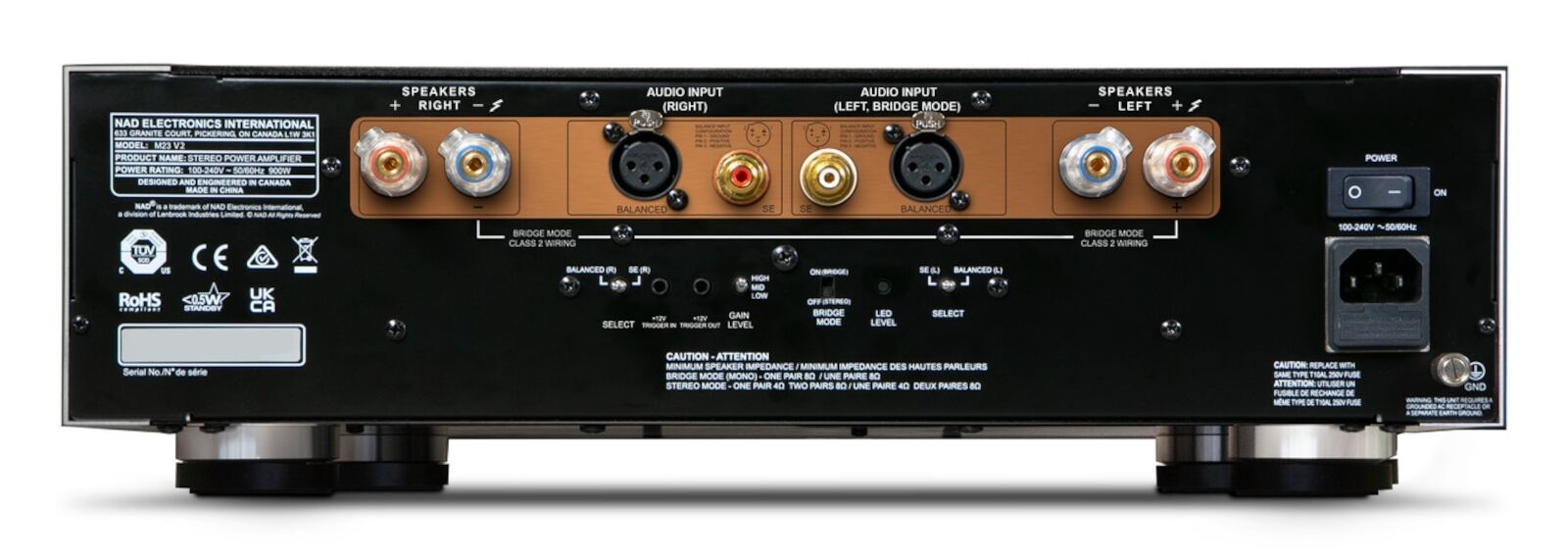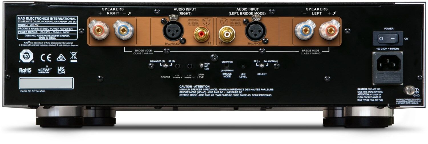 Besitzern eines NAD M33 Streaming-Vollverstärkers bietet sich zudem die Möglichkeit, ihre HiFi-Anlage zu einem System mit 2 x 700 Watt Dauerleistung auszubauen. Hier übernimmt dann der gebrückte M33 die Verstärkung des einen und die in Brückenschaltung laufende M23 V2 die des anderen Stereo-Kanals.