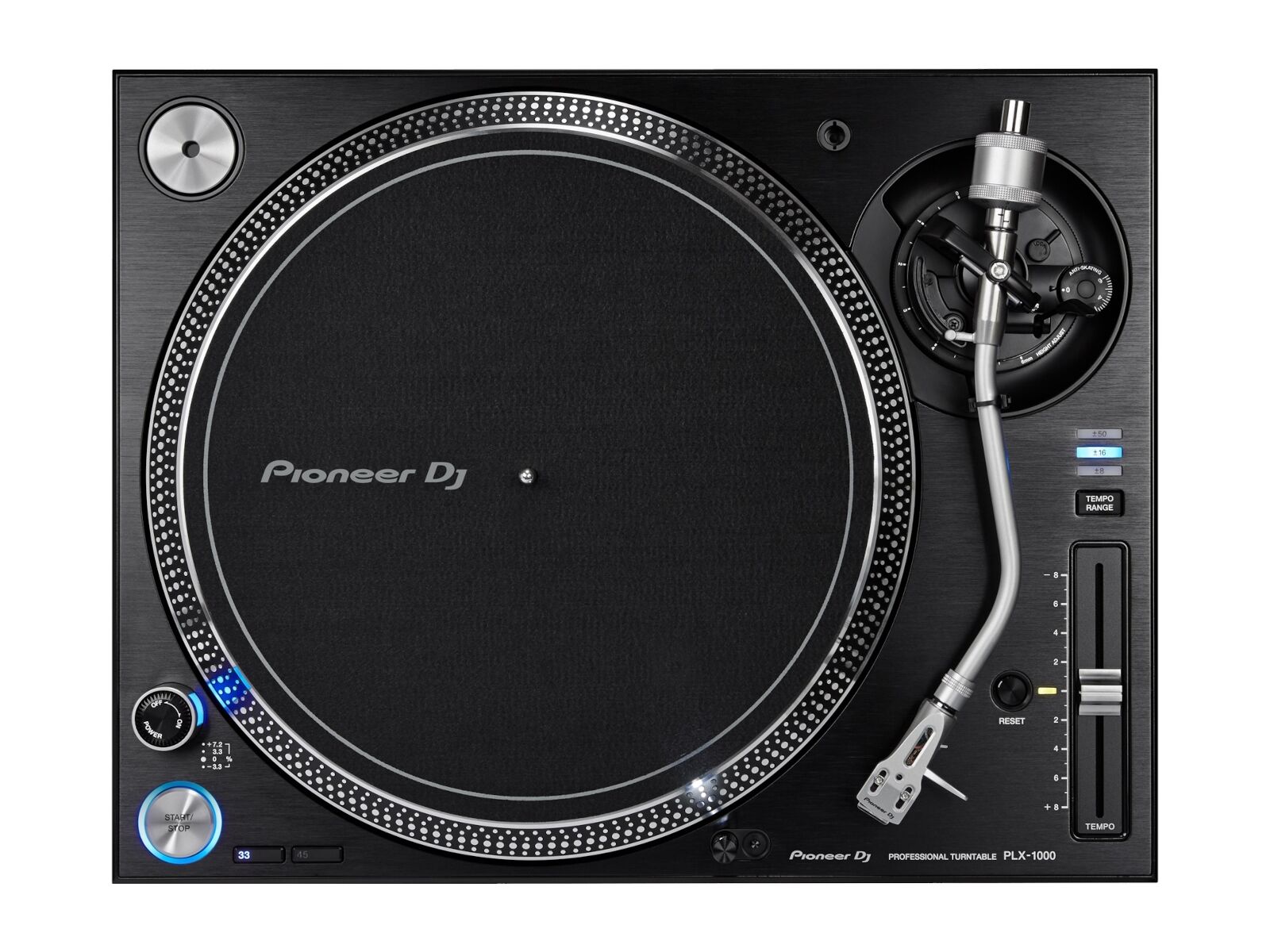 Dank der mehrfachen Temposteuerung kannst du die Drehung des Plattentellers jederzeit um ±8%, ±16% und ±50% beschleunigen oder verlangsamen, während ein Druck auf den Resetknopf sie sofort wieder auf ± 0 % setzt.