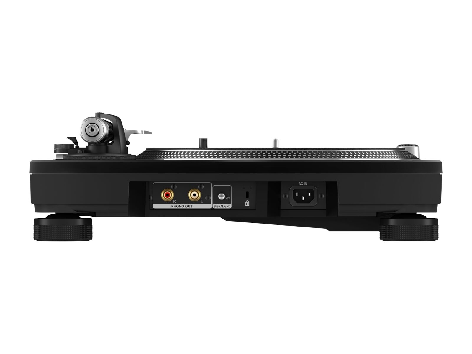 Um Resonanzen und Vibrationen vorzubeugen, besteht das Chassis des PLX-1000 aus solidem Zinkdruckguss. Der untere Teil ist mit 8 mm starkem Harz und einer 9 mm starken Schicht aus vibrationshemmendem Material verstärkt. Der per Gummi entkoppelte Tonarm reduziert Heuleffekte, während eine Isolierung aus Gummi und Federn externe Vibrationen absorbiert.