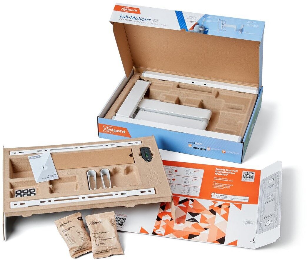 Die Installation der Vogel's COMFORT Full-Motion+ TV-Wandhalterung ist einfach: Eine Bohrschablone, Schrauben, DuoPower-Dübel von Fischer®, Wasserwaage und Kabelbinder sind im Lieferumfang enthalten.