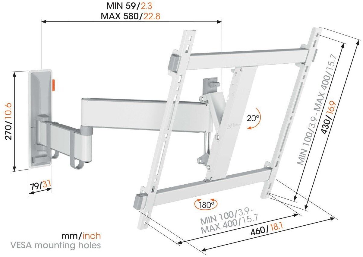 - Dank der 58 cm langen Arme drehen Sie Ihren Fernseher um bis zu 180°