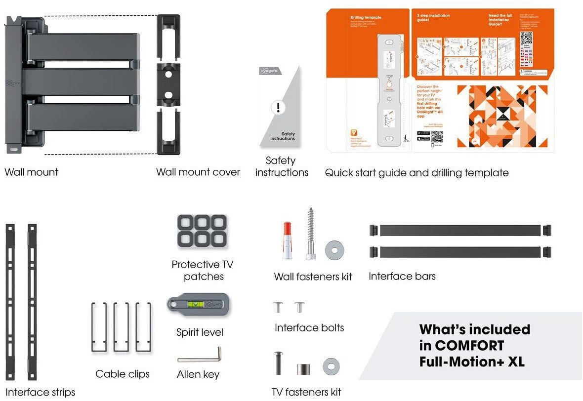 Die Installation der COMFORT Full-Motion+ TV-Wandhalterung ist ganz einfach. Die Kurzanleitung zur Installation und das Anleitungsvideo führen Sie durch den Ablauf. Eine Bohrschablone, Schrauben, DuoPower-Dübel von fischer®, Kabelbinder und eine Wasserwaage sind im Lieferumfang enthalten. Und mit unserer kostenlosen DrillRight app ist es ganz einfach, Ihr erstes Bohrloch zu markieren. Wenn Ihr Fernseher nach der Montage leicht schief steht, können Sie mithilfe des speziellen Verstellmechanismus auch nach der Montage sicherstellen, dass er sich in einer vollständig horizontalen Position befindet. Um zu verhindern, dass die Rückseite Ihres Fernsehers bei der Montage zerkratzt wird, enthält das Set außerdem einen Satz weicher Schutzkappen.