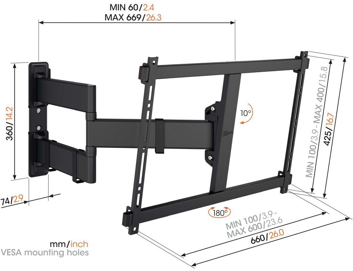 Die ultralangen Arme bieten eine breite Spanne an Drehbewegungen. Wie breit? Das hängt von der Größe Ihres Fernsehers ab. Im ausgefahrenem Zustand befindet sich Ihr Fernseher 69 cm von der Wand entfernt.